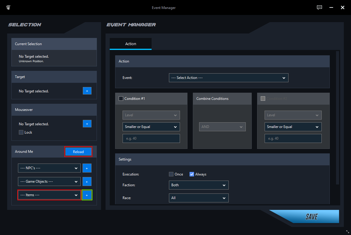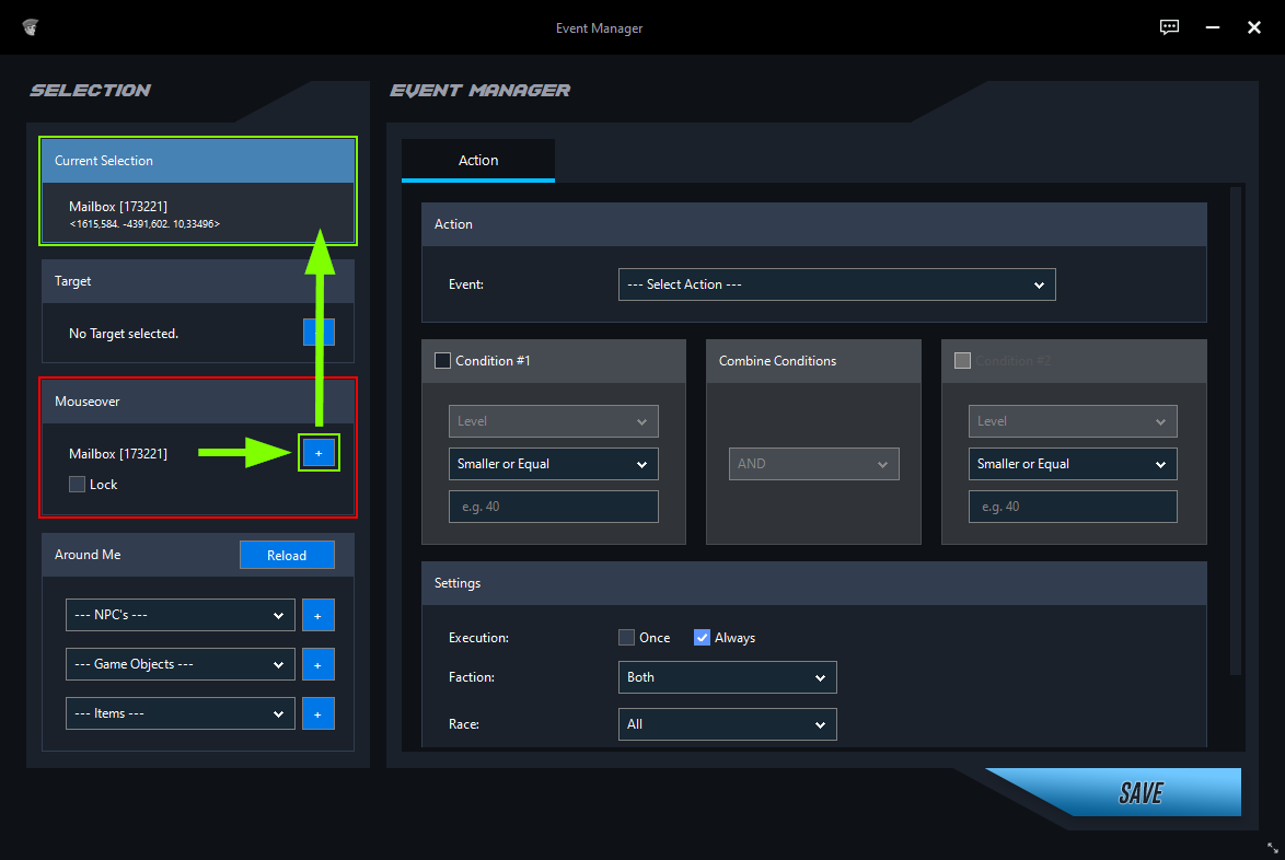 If the object does not appear in the "Mouseover" box, you can alternatively select it in the "Around Me" box under Game Objects. Click the "Reload" button to update the selection fields.