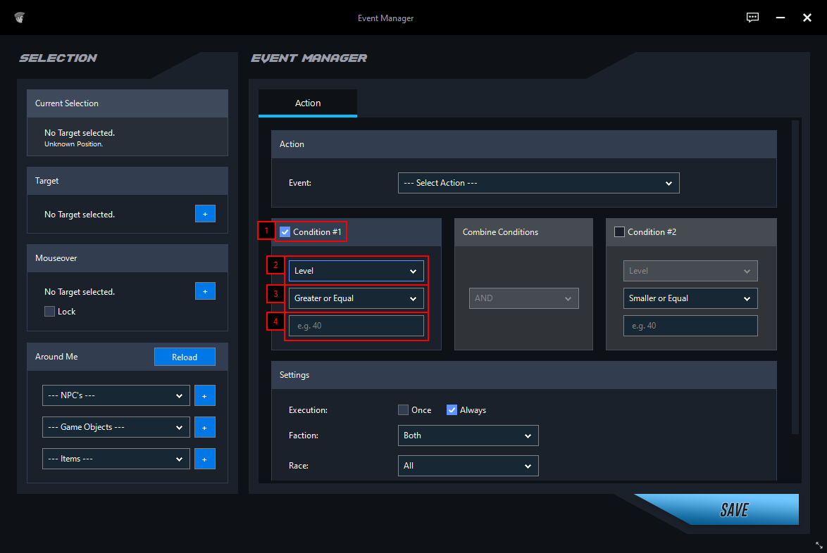 1. Activate "Condition #1" if you want to set a condition for this event.