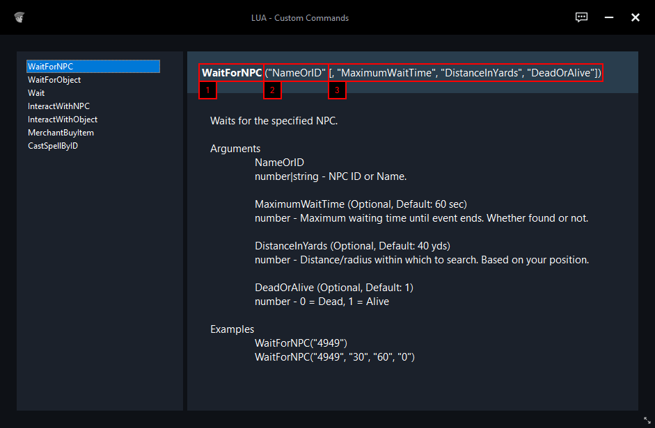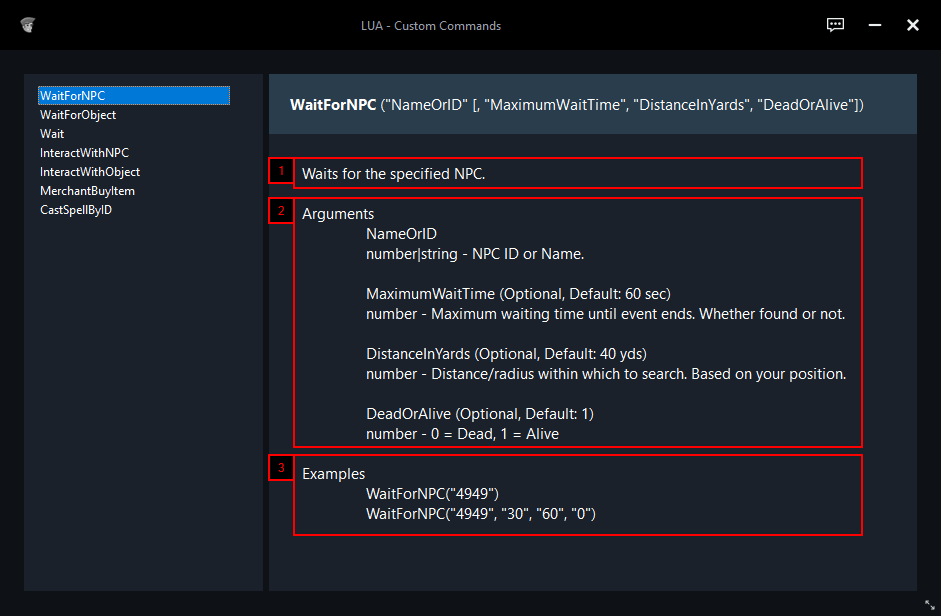 To explain the structure, we click on the "WaitForNPC" command on the left.