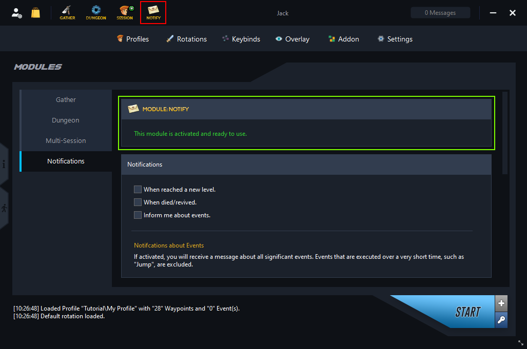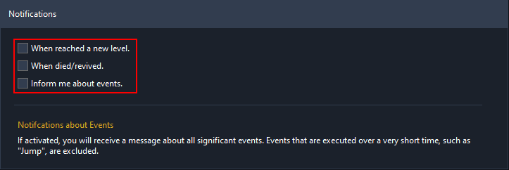 The "Events" notifications are limited to informative events like changing a zone, entering/leaving a dungeon, and many more.
