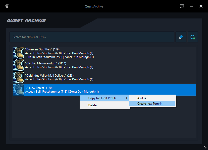 By right-clicking on the respective quest, you can remove the quest from your archive or add it to your current profile.