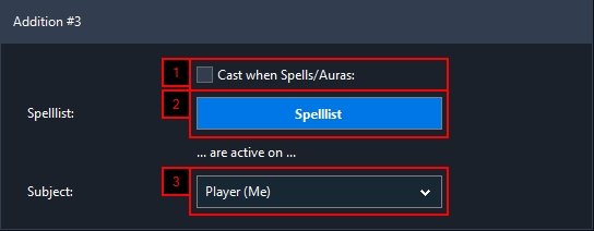 Enable to execute the spell only if one or more spells in the specified list (2.) are active on the specified unit (3.).