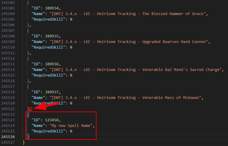Open the file Spells.json with an editor of your choice.